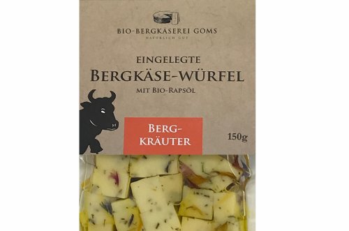 Kräuter-Bergkäse aus Bio-Roh-Milch, Schweizer Halbhartkäse, vollfett aus eigener Herstellung mit Bio-Kräutermischung*: Majoran, Oregano, Bohnenkraut, Borretsch, Thymian, Ysop, Liebstöckel (Bergland Produkte, CH-3995 Ernen VS), Bio-Rapsöl* (CH), Blüten-Mix*(CH): Calandula, Kornblumen, Goldmelisse.