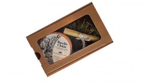 Baschi Chääs (ca. 800 g) im Heu eingebettet in einer umweltfreundlichen, naturbraunen Präsent-Schachtel mit Sichtfenster.