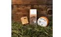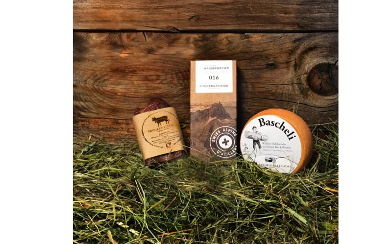 Edel verpacktes, hochprozentiges Wanderwasser von der Swiss Alpin Destillerie (Haldi Hof), Gommer Bio-Trockenfleisch (ca. 300g) vom Bio-Hof Eisenmeier Müller in Geschinen und ein Bascheli dazu (falls nicht verfügbar: alternativ eine "Ecke" milden Bio-Gomser).