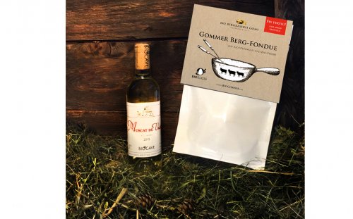 Fondue-Plausch zu zweit mit einer Flasche Bio-Weisswein (5 dl) und unserem Bio-Käsemix (ca. 400g) inklusive Rezept für die Zubereitung.