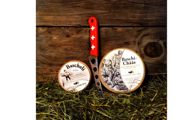 Der grosse "Feuer-Baschi" (Bio-Halbhartkäse mit Chili ca. 800 g) mit dem kleinen "Bascheli" (Bio-Halbhartkäse, ca.300 g) und dazu ein scharfes Schweizer-Käsemesser.